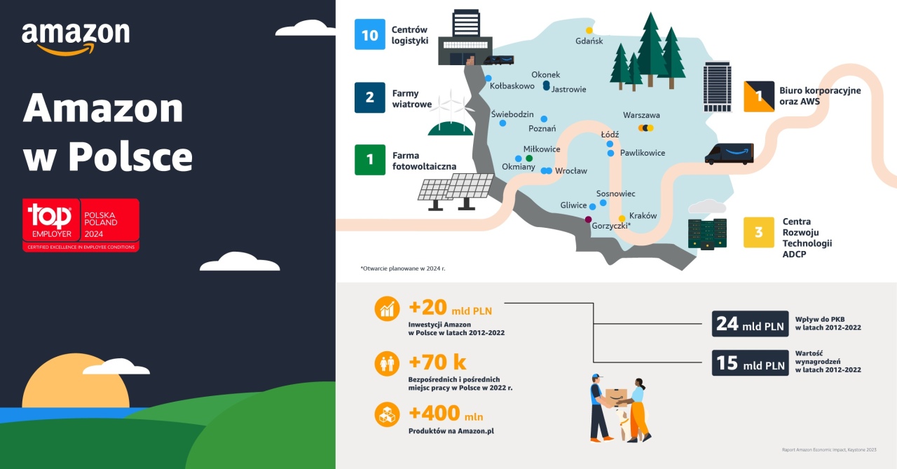 W 2024 r. Amazon świętuje dekadę działalności w Polsce, z ponad 20 mld PLN inwestycji w kraju, czego efektem było m.in. utworzenie do 2022 r. ponad 70 000 nowych bezpośrednich i pośrednich miejsc pracy w kraju. Obecność Amazon w tej części Europy to również dbałość o lokalne społeczności i zrównoważony rozwój.